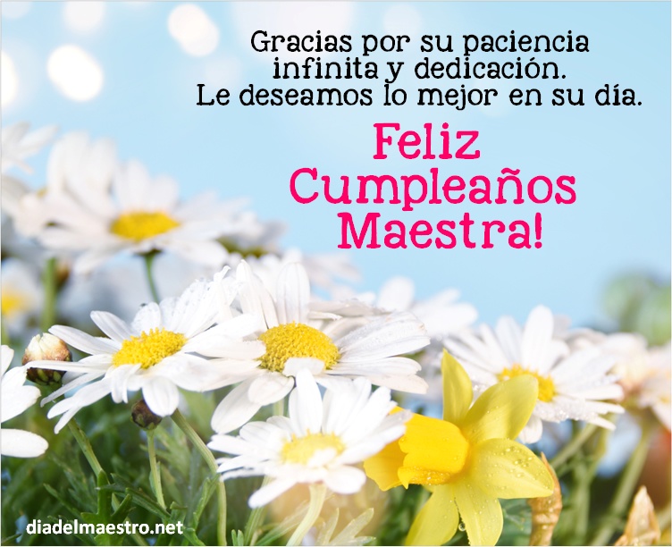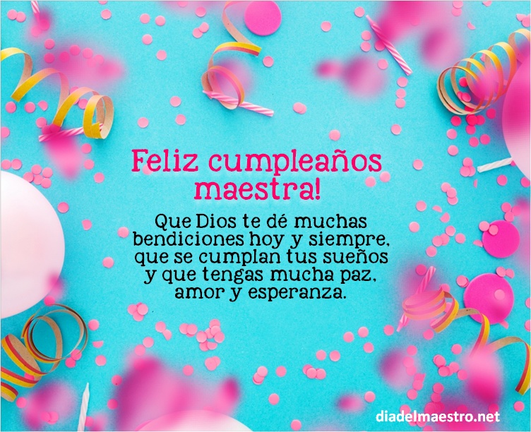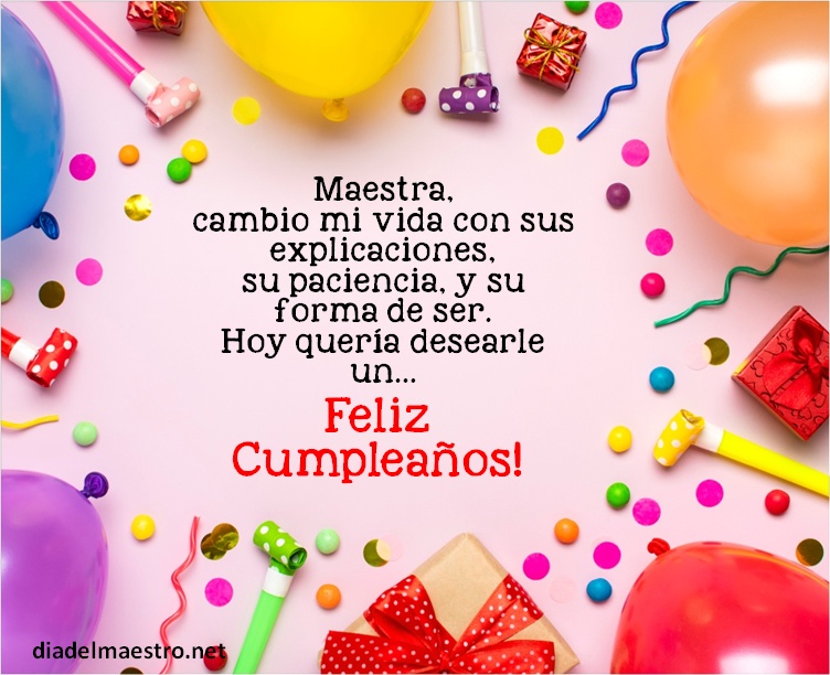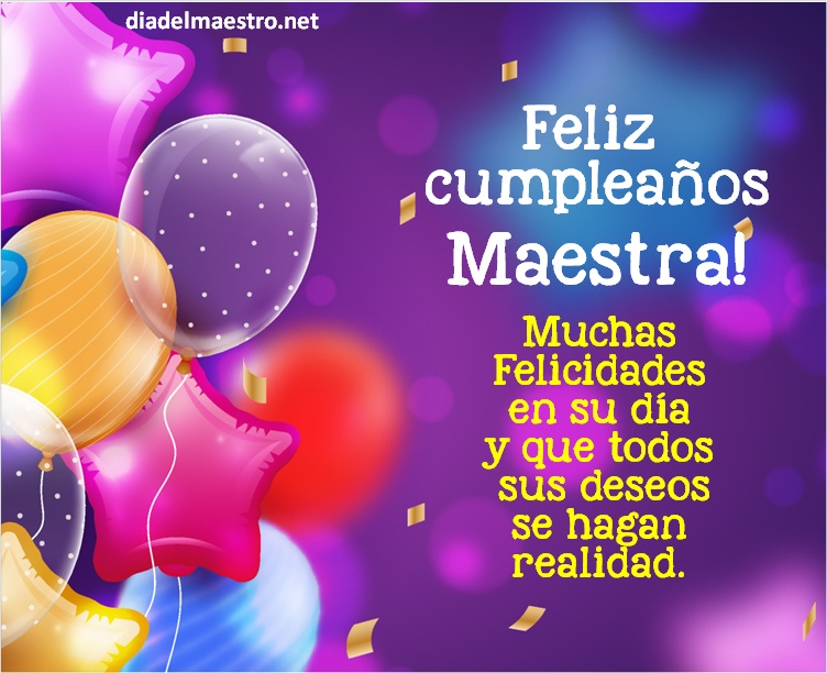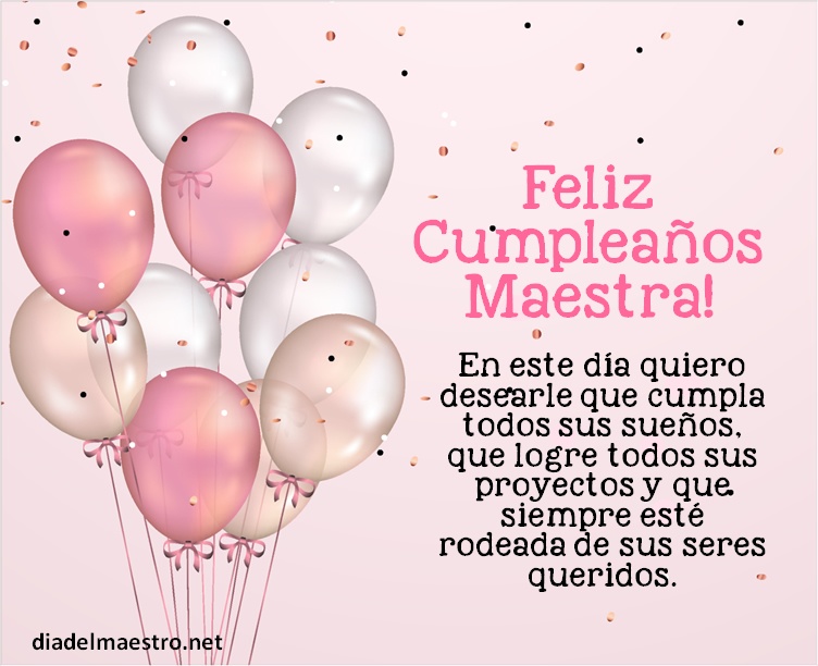 5 ¡Feliz cumpleaños maestra! En este día quiero desearle que cumpla todos sus sueños, que logre todos sus proyectos y que siempre esté rodeada de sus seres queridos.